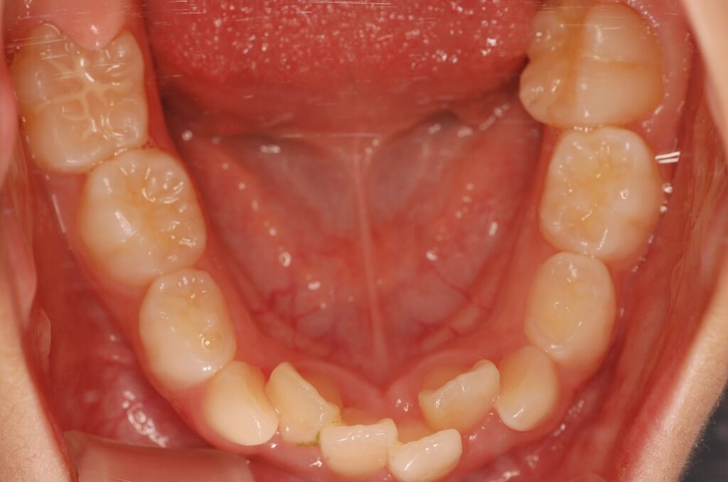 こちらの症例は、向かって右側の一番奥の歯が内側に倒れこんでいるのがわかると思います。